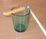 2. Aseta ongessa oleva lovi lasin reunaan. Ala kiertää vapaa lasin vastakkaisen reunan ulkopuolella niin, että naru kiertyy yläkautta vavan ympärille ja kiristää ongen koukkuosan tiukalle. Nyt voit nostaa lasin ilmaan!